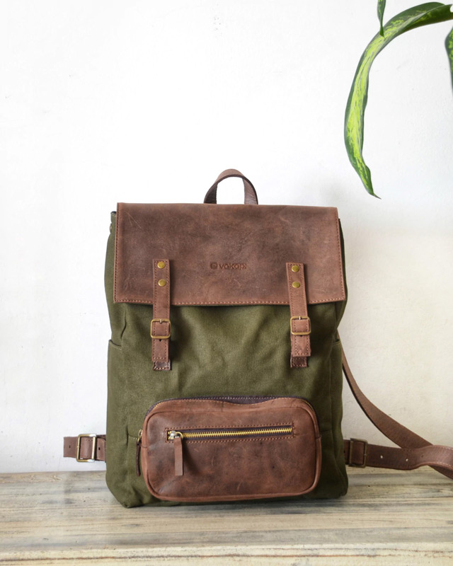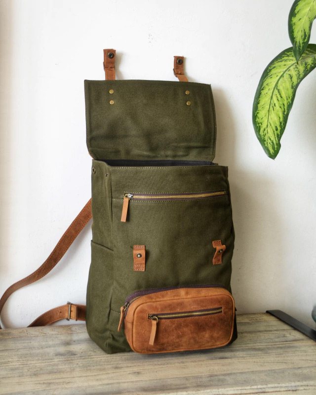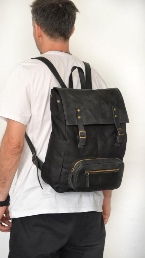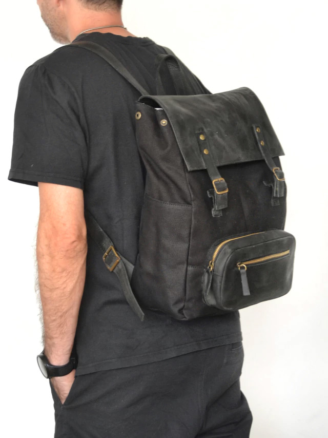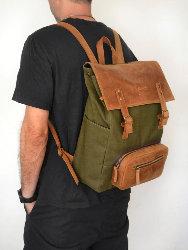 Mochila realizada en Cuero vacuno engrasado y lona de algodon gruesa, un equilibrio ideal para quien busca una opcion descontractura y super versatil para todos los dias.