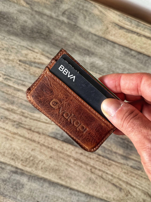 El Tarjetero Cali está elaborado en cuero natural de alta calidad, ofreciendo una opción compacta y funcional para organizar las tarjetas con estilo.
